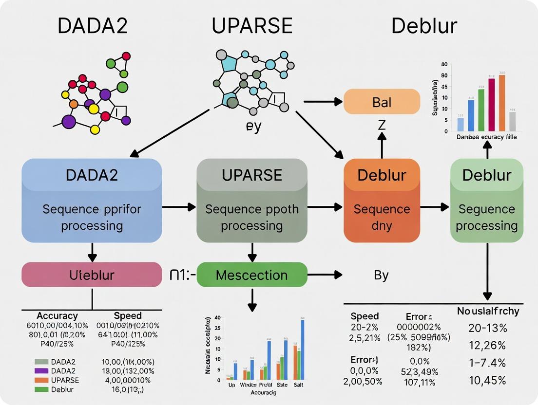 Within the benchmark research comparing DADA2, UPARSE, and Deblur for 16S rRNA amplicon processing, UPARSE stands out for its robust heuristic clustering algorithm and integrated chimera filtering. This guide compares its performance against DADA2 (error-correction) and Deblur (error-correction) approaches.