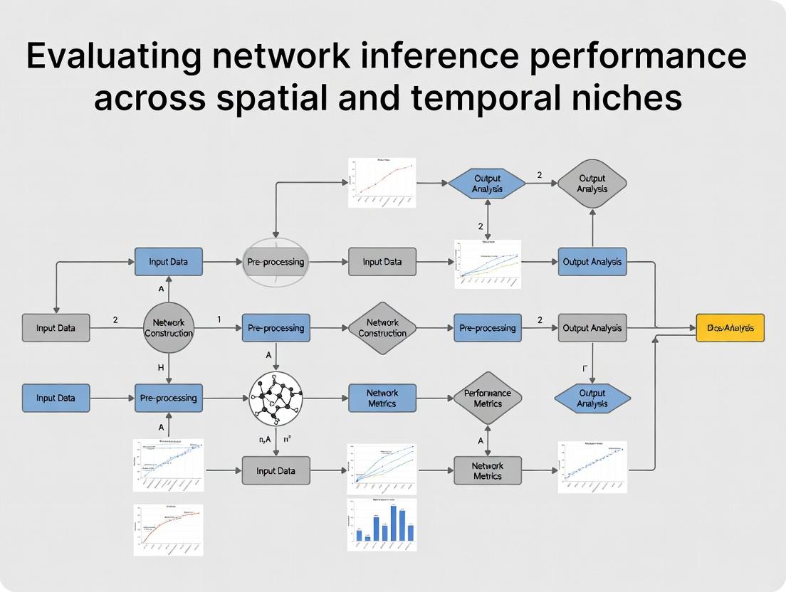 Effective evaluation of network inference performance requires a paradigm shift from static to spatial-temporal thinking, acknowledging that biological function emerges from dynamic interactions within specific niches. This review synthesizes that foundational understanding, methodological toolkits, troubleshooting strategies, and rigorous validation frameworks are all critical. The key takeaway is that no single method performs optimally across all contexts; selection must be guided by the specific biological question, data modalities, and required resolution. Future directions must focus on integrating higher-resolution spatial proteomics and live-cell imaging data, developing context-aware algorithms, and establishing community-agreed benchmarking standards. These advances are pivotal for translating inferred networks into clinically actionable insights, such as identifying dynamic therapeutic targets and understanding mechanisms of drug resistance in complex diseases.