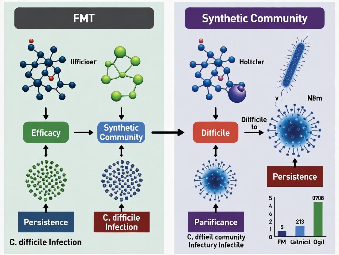 This guide compares the performance of Fecal Microbiota Transplantation (FMT) and Defined Synthetic Microbial Communities (SynComs) in treating Clostridioides difficile infection (CDI), with a focus on engraftment dynamics, resilience, and persistence post-treatment.