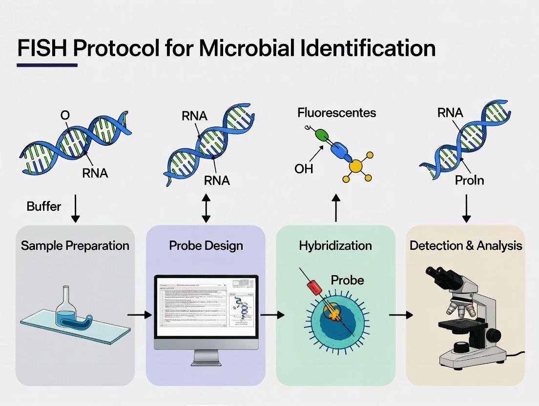 Step 2: Probe Design and Labeling Probes are short (15-30 nucleotides) DNA oligonucleotides complementary to phylogenetically informative regions of 16S or 23S rRNA. They are synthesized with a fluorescent dye (e.g., CY3, FITC) covalently attached at the 5' end.