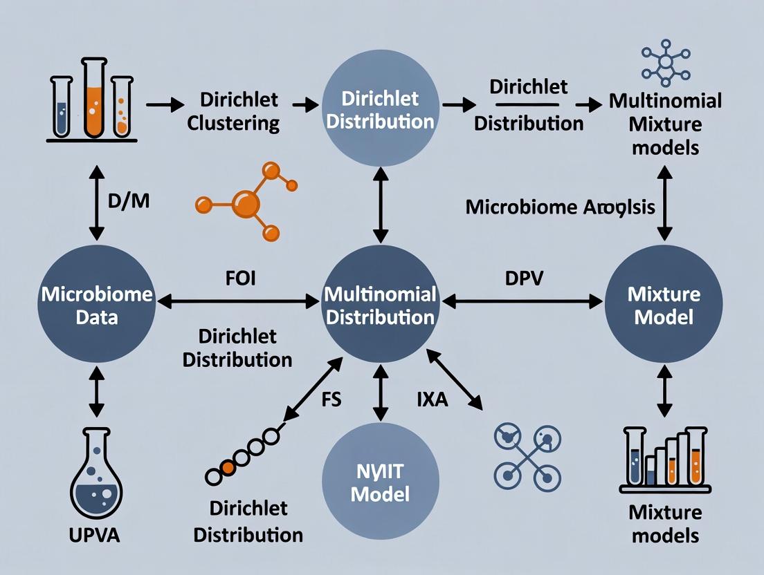 Within the context of Dirichlet Multinomial Mixture (DMM) models for microbiome clustering research, understanding the foundational probability distributions is essential. The Dirichlet distribution serves as a conjugate prior for the Multinomial distribution in a Bayesian framework. This relationship allows researchers to model the over-dispersed, compositionally complex count data typical in 16S rRNA gene sequencing studies, where microbial taxa counts across samples are multivariate and sparse.
